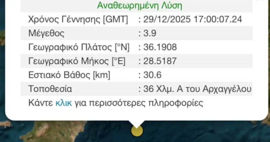 Σεισμική δόνηση, εντάσεως 3,9 Ρίχτερ, σημειώθηκε στη Ρόδο, το απόγευμα της Δευτέρας.