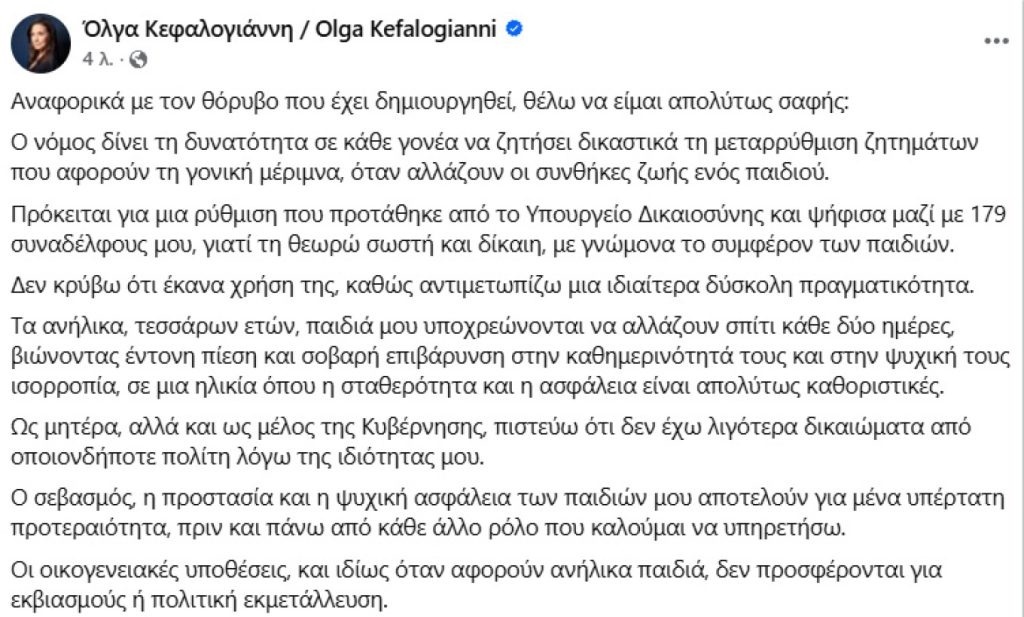 Η κυρία Κεφαλογιάννη, μάλιστα, στην ανάρτησή της, που σύμφωνα με πληροφορίες έγινε μεν με δική της πρωτοβουλία, αλλά σε συνεννόηση με το Μαξίμου προκειμένου «να μπει η υπόθεση στη σωστή της διάσταση», υποστηρίζει ότι αντιμετωπίζει δύσκολη κατάσταση, περιγράφοντας τις συνέπειες της συνεπιμέλειας: «Αντιμετωπίζω μια ιδιαίτερα δύσκολη πραγματικότητα. Τα ανήλικα, τεσσάρων ετών, παιδιά μου υποχρεώνονται να αλλάζουν σπίτι κάθε δύο ημέρες, βιώνοντας έντονη πίεση και σοβαρή επιβάρυνση στην καθημερινότητά τους και στην ψυχική τους ισορροπία, σε μια ηλικία όπου η σταθερότητα και η ασφάλεια είναι απολύτως καθοριστικές». Παράλληλα, η υπουργός Τουρισμού υποστηρίζει ότι ως μητέρα, αλλά και ως υπουργός πιστεύει ότι δεν έχει λιγότερα δικαιώματα από οποιονδήποτε πολίτη λόγω της ιδιότητάς της και καταλήγει σημειώνοντας ότι «Οι οικογενειακές υποθέσεις, και ιδίως όταν αφορούν ανήλικα παιδιά, δεν προσφέρονται για εκβιασμούς ή πολιτική εκμετάλλευση».
