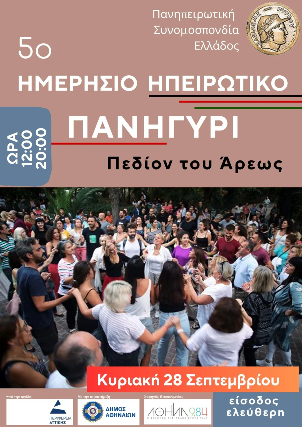 Η «Πανηπειρωτική Συνομοσπονδία Ελλάδας» (Π.Σ.Ε.), ο κορυφαίος φορέας της Ηπειρώτικης αποδημίας, προσκαλεί σε μεγάλο Ημερήσιο Πανηγύρι στην καρδιά της Αθήνας στο πεδίον του Άρεως, την Κυριακή 28 Σεπτεμβρίου 2025, από τις 12 το μεσημέρι, όλη μέρα, μέχρι τις 8 το βράδυ! Με ελεύθερη είσοδο!