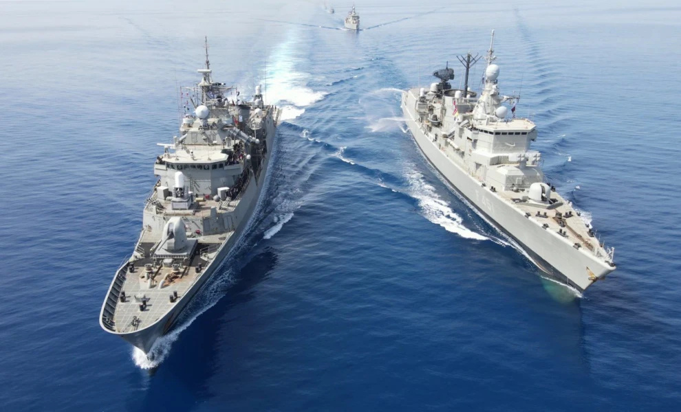 Πρόκειται για τη φρεγάτα «Κίμων» και ακόμη μία φρεγάτα, η οποία φέρει το σύστημα αντιμετώπισης μη επανδρωμένων αεροχημάτων «Κένταυρος».