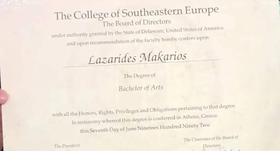 Το 1987 έκανα μία συνειδητή επιλογή, σε ηλικία 18 ετών, να σπουδάσω σε ένα κολέγιο, στο κολέγιο of the Southeastern Europe, ένα από τα δύο μεγαλύτερα κολέγια τότε στην Ελλάδα. Αποφοίτησα το 1992, αυτό είναι το πτυχίο μου, είπε ο υφυπουργός Αγροτικής Ανάπτυξης Μακάριος Λαζαρίδης, απαντώντας στις φήμες για το αν έχει πτυχίο ή όχι.