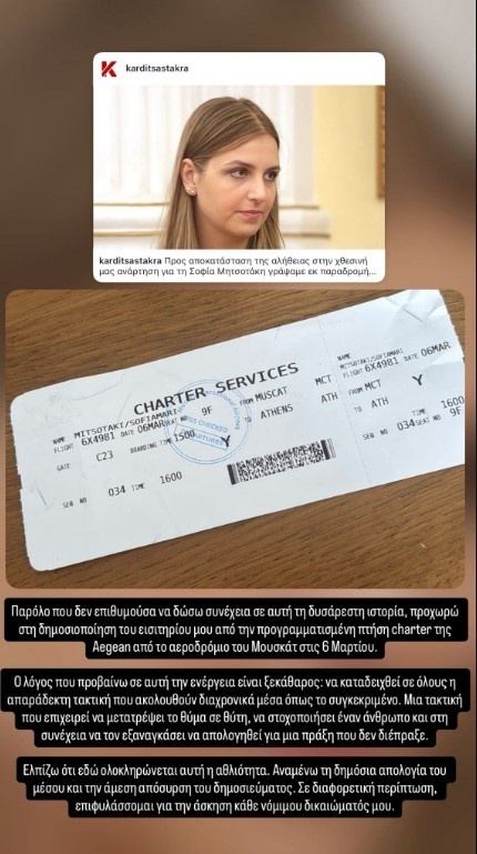 Τέλος στην έντονη παραφιλολογία και τις κατηγορίες που εκτοξεύθηκαν εναντίον της επιχείρησε να θέσει η Σοφία Μητσοτάκη, δίνοντας στη δημοσιότητα το εισιτήριο της πτήσης της από το αεροδρόμιο της Μουσκάτ με ημερομηνία 6 Μαρτίου 2026. Η κίνηση αυτή αποτελεί την οριστική απάντηση της κόρης του πρωθυπουργού σε μια υπόθεση που ξεκίνησε από ανώνυμα δημοσιεύματα, τα οποία υποστήριζαν ότι επέστρεψε εσπευσμένα από το Ντουμπάι λόγω της πολεμικής σύρραξης στο Ιράν, χρησιμοποιώντας ιδιωτικό αεροσκάφος. Οι συγκεκριμένοι ισχυρισμοί προκάλεσαν θύελλα αντιδράσεων, καθώς έκαναν λόγο για ένα υπέρογκο κόστος ύψους 50.000 ευρώ, το οποίο μάλιστα υποτίθεται πως χρεώθηκε στους Έλληνες φορολογούμενους.