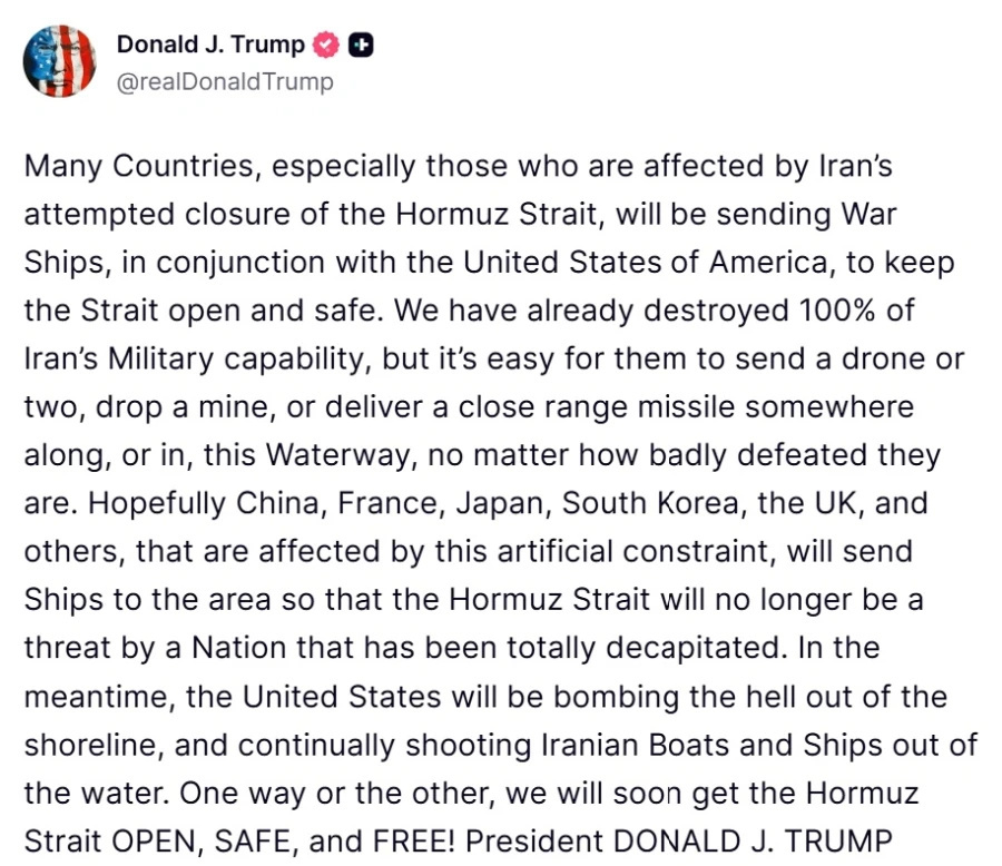«Πολλές χώρες, ειδικά εκείνες που επηρεάζονται από την απόπειρα κλεισίματος των Στενών του Ορμούζ από το Ιράν, θα στείλουν πολεμικά πλοία, σε συνεργασία με τις Ηνωμένες Πολιτείες Αμερικής, για να διατηρήσουν τα Στενά ανοιχτά και ασφαλή. Έχουμε ήδη καταστρέψει το 100% της στρατιωτικής ικανότητας του Ιράν, αλλά είναι εύκολο για αυτούς να στείλουν ένα ή δύο drone, να ρίξουν μια νάρκη ή να εκτοξεύσουν έναν πύραυλο κοντινής εμβέλειας κάπου κατά μήκος ή μέσα σε αυτήν την πλωτή οδό, ανεξάρτητα από το πόσο άσχημα έχουν ηττηθεί. Ας ελπίσουμε ότι η Κίνα, η Γαλλία, η Ιαπωνία, η Νότια Κορέα, το Ηνωμένο Βασίλειο και άλλες χώρες, που επηρεάζονται από αυτόν τον τεχνητό περιορισμό, θα στείλουν πλοία στην περιοχή, ώστε τα Στενά του Ορμούζ να μην αποτελούν πλέον απειλή από ένα έθνος που έχει αποκεφαλιστεί εντελώς. Εν τω μεταξύ, οι Ηνωμένες Πολιτείες θα βομβαρδίζουν την ακτογραμμή και θα πυροβολούν συνεχώς ιρανικά σκάφη και πλοία έξω από το νερό. Με τον έναν ή τον άλλο τρόπο, σύντομα θα καταστήσουμε τα Στενά του Ορμούζ, ΑΝΟΙΧΤΑ, ΑΣΦΑΛΗ και ΕΛΕΥΘΕΡΑ! Πρόεδρος Ντόναλντ Τζ. Τραμπ».