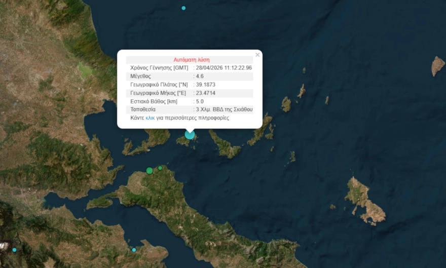 Σύμφωνα με τα πρώτα στοιχεία, ο σεισμός είναι ισχύος 4,6 Ρίχτερ με το επίκεντρό του να είναι ανοιχτά της Σκιάθου.