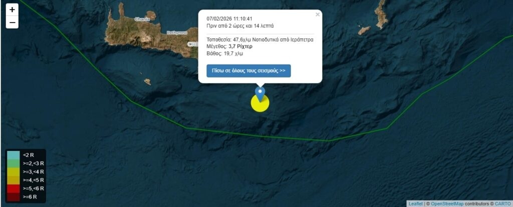 Σεισμός 3,7 Ρίχτερ 47,6χλμ Νοτιοδυτικά από Ιεράπετρα στις 07/02/2026