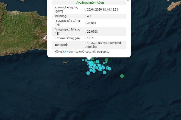 Το επίκεντρο της σεισμικής δόνησης εντοπίστηκε 18χλμ νοτιοδυτικά του Γουδουρά Λασιθίου ενώ το εστιακό βάθος εκτιμάται στα 11χλμ.