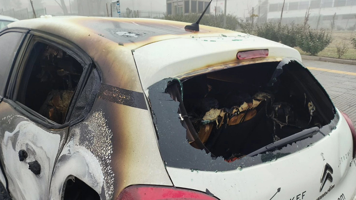 Από τη ρίψη μολότοφ ένα αυτοκίνητο καταστράφηκε ολοσχερώς ενώ άλλα δύο αυτοκίνητα έχουν υποστεί σοβαρές φθορές