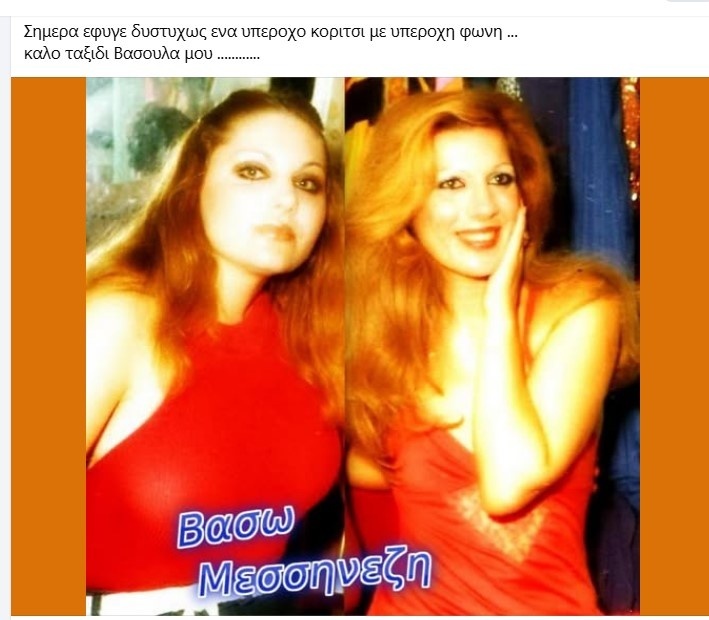 «Σήμερα έφυγε δυστυχώς ένα υπέροχο κορίτσι με υπέροχη φωνή καλό ταξίδι Βασούλα μου», έγραψε στην ανάρτησή της η Σου Κύρκου.