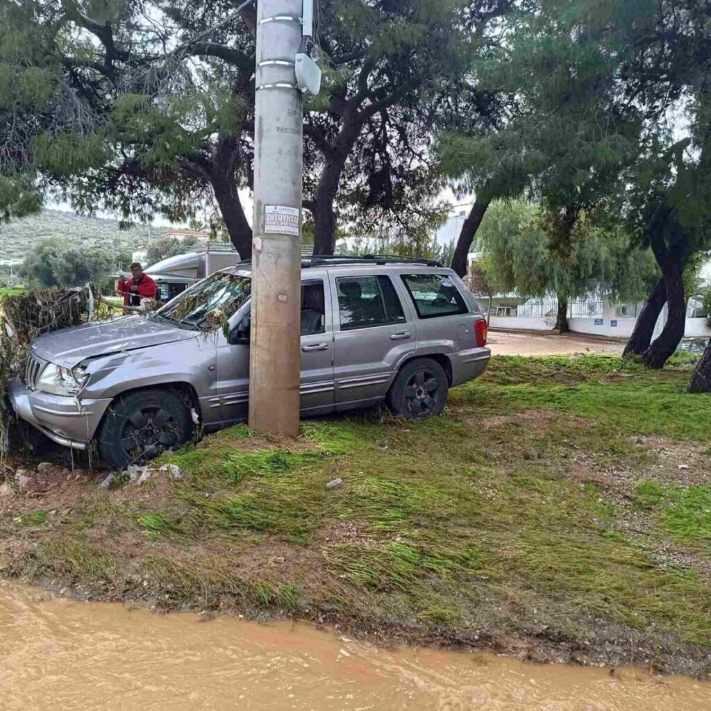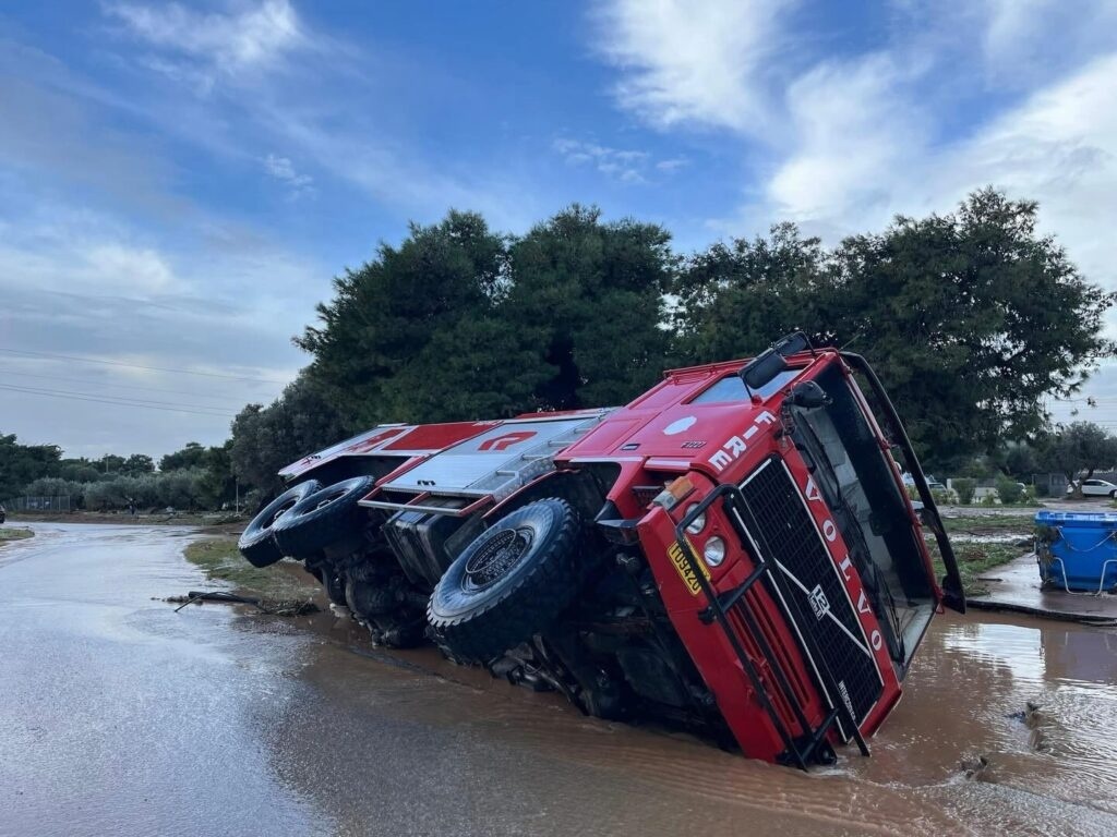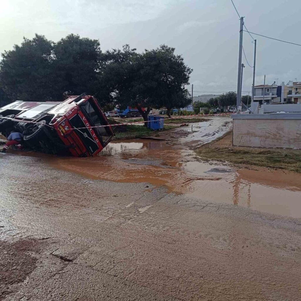 Με τη χθεσινή βροχόπτωση να αγγίζει ρεκόρ ποσότητας νερού ανά στρέμμα, αναποδογύρισε και όχημα της Πολιτικής Προστασίας με την ονομασία «Βάρη 2», λόγω καθίζησης του οδοστρώματος.