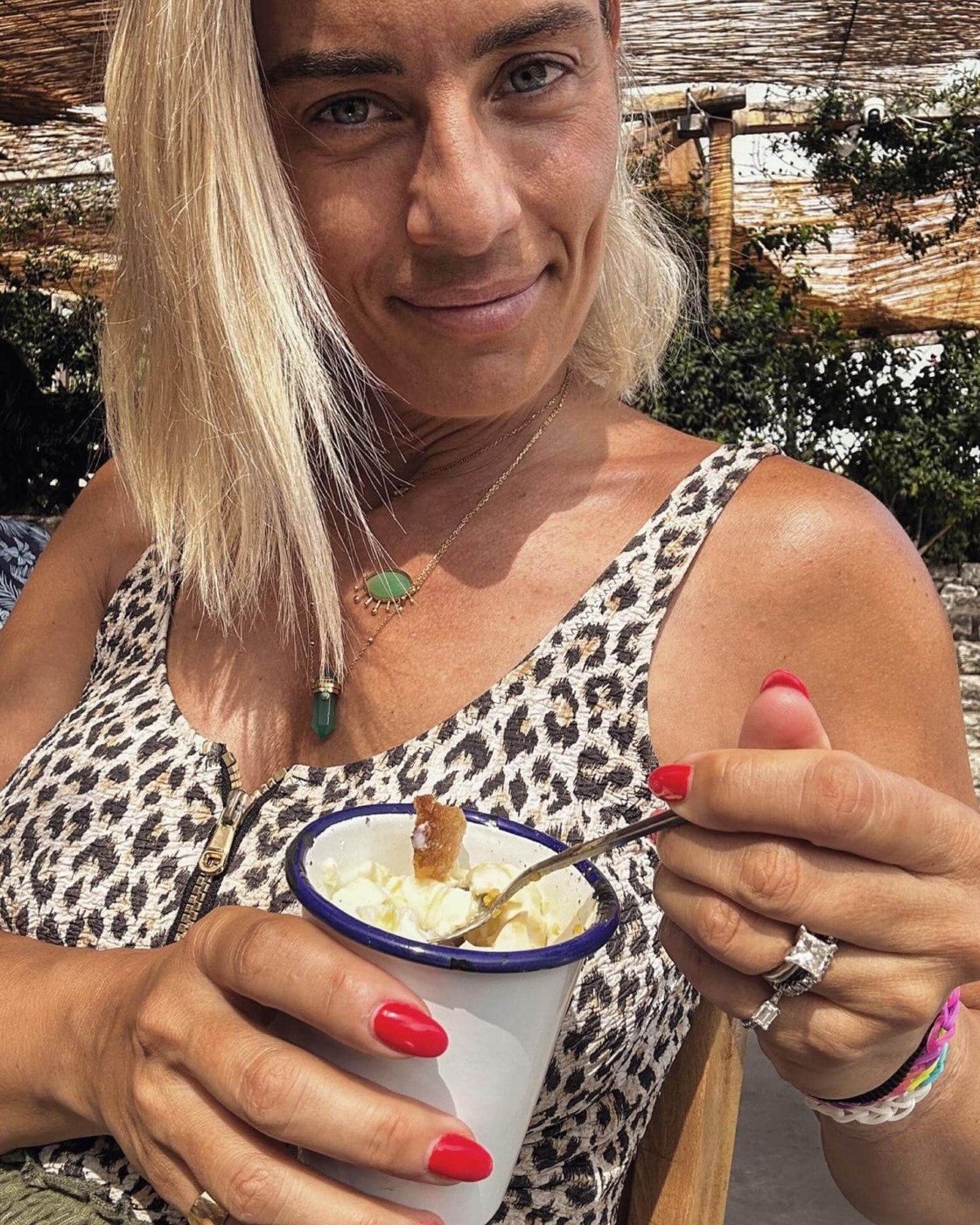 Στη φωτογραφία, η ίδια απολαμβάνει ένα απλό αλλά γεμάτο αναμνήσεις πρωινό, το οποίο συνδέεται στενά με τις πιο τρυφερές στιγμές της παιδικής της ηλικίας.