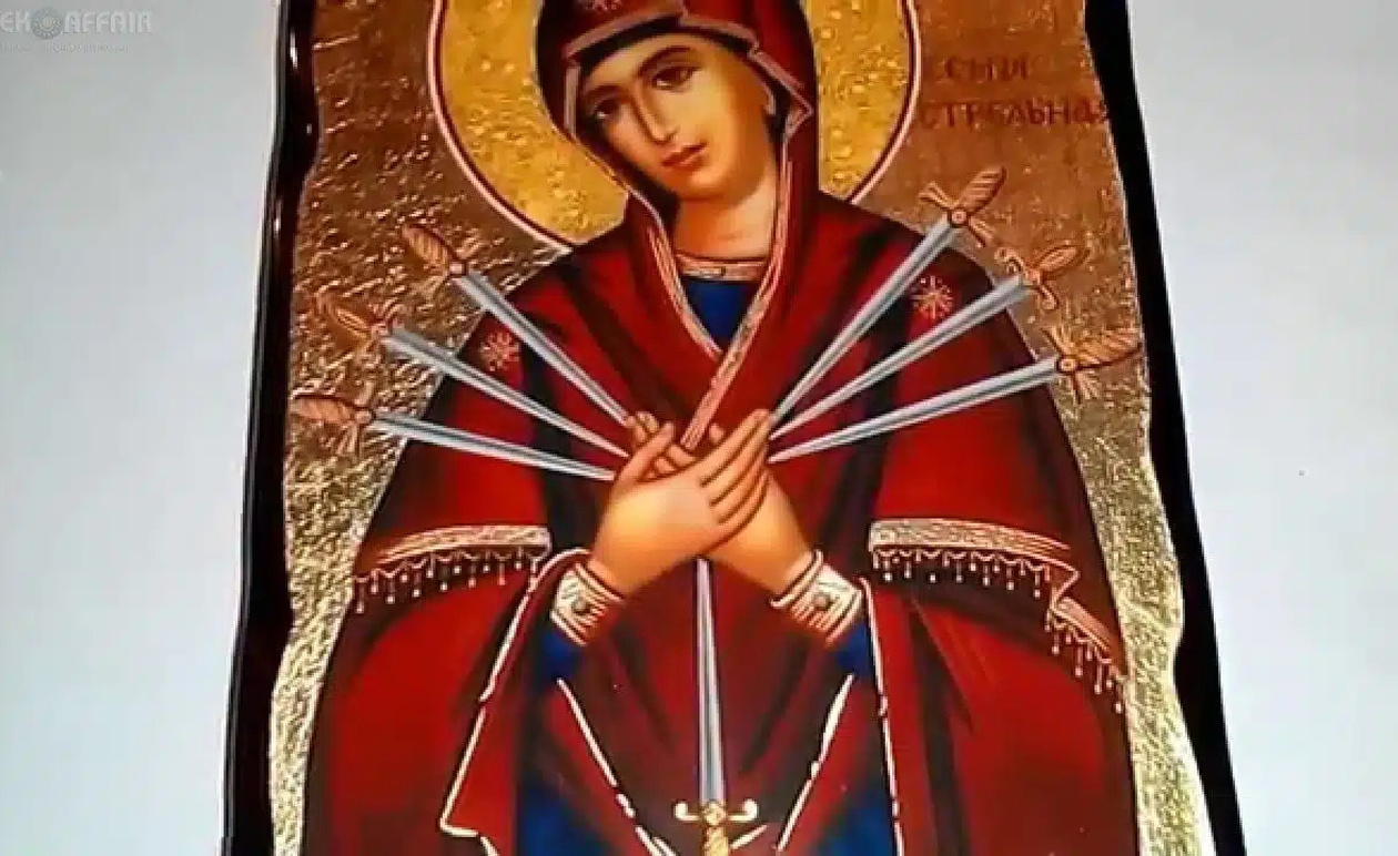 Η Μητέρα του Θεού είναι ζωγραφισμένη σε μία ασυνήθιστη θέση, μόνη, χωρίς το Θείο Βρέφος. Την διαπερνούν επτά βέλη. Υπάρχει η ακόλουθη ιστορία γι’ αυτήν την εικόνα: