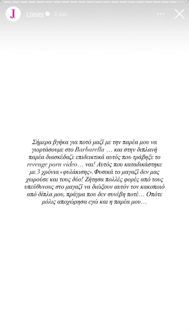 «Σήμερα βγήκα για ποτό μαζί με την παρέα μου να γιορτάσουμε στο Berbarella… και στην διπλανή παρέα διασκέδαζε αυτός που τράβηξε το revenge porn video… ναι! Αυτός που καταδικάστηκε με 3 χρόνια «φυλάκισης».