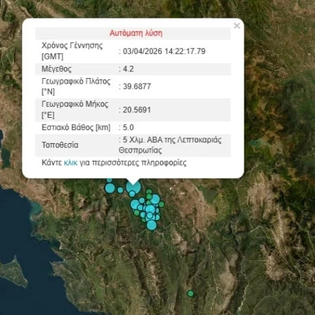 Σεισμική δόνηση έντασης 4,2 Ρίχτερ καταγράφηκε το απόγευμα της Παρασκευής στη Θεσπρωτία. Ο σεισμός σημειώθηκε στις 17:22, με εστιακό βάθος 5 χιλιομέτρων, περίπου 5 χιλιόμετρα ανατολικά-βορειοανατολικά της περιοχής Λεπτοκαριά.