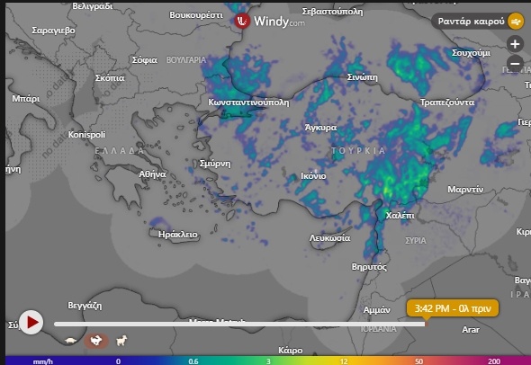 Tο ραντάρ με τον καιρό ΤΩΡΑ, μέσα από το WINDY που χρησιμοποιεί τα προγνωστικά μοντέλα GFS, ECMWF και NEMS