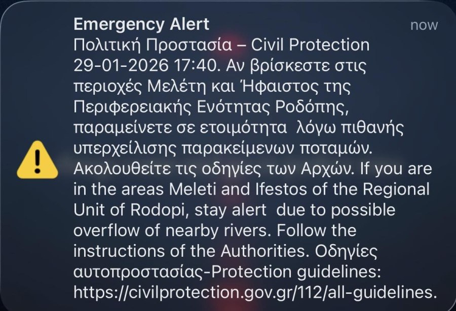Στο προειδοποιητικό μήνυμα που εστάλη στα κινητά τηλέφωνα αναφέρεται χαρακτηριστικά: «Αν βρίσκεστε στις περιοχές Μελέτη και Ήφαιστος της Περιφερειακής Ενότητας Ροδόπης, παραμείνετε σε ετοιμότητα λόγω πιθανής υπερχείλισης παρακείμενων ποταμών».