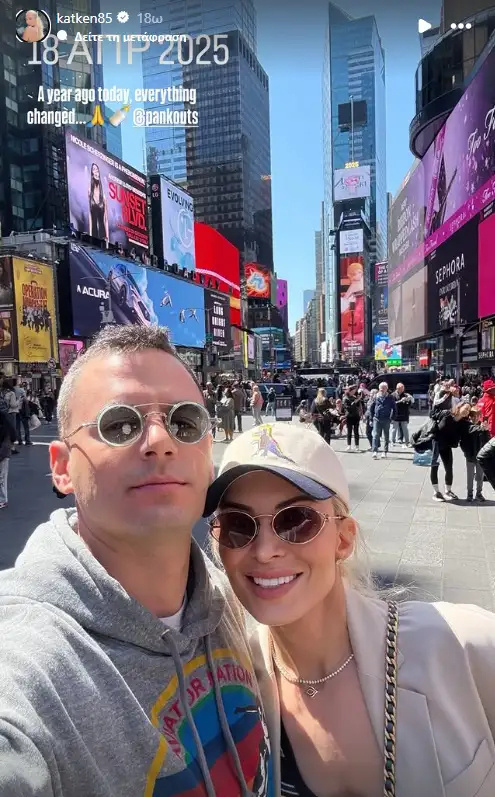 Η γνωστή παρουσιάστρια, που είχε συνηθίζει να μοιράζεται συνεχώς στιγμές της με τους θαυμαστές της στα social media, μετά τη γέννηση της κορούλας της έχει πάρει κάποιες αποστάσεις και ανεβάζει μόνο λίγες και σημαντικές φωτογραφίες. Το βράδυ του Σαββάτου (19.04.2026) η Κατερίνα Καινούργιου μοιράστηκε μία φωτογραφία με τον Παναγιώτη Κουτσουμπή από τη Νέα Υόρκη, όπου βρίσκονταν ακριβώς πριν από έναν χρόνο.