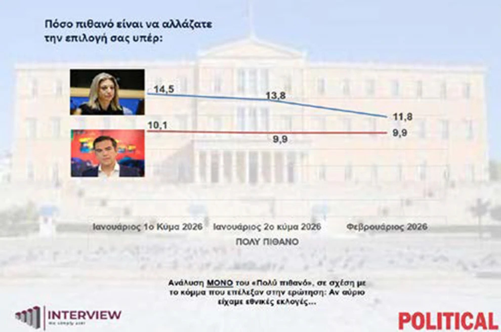 Δημοσκόπηση Interview: Αγγίζει το 32% η ΝΔ – Στάσιμος ο Τσίπρας, πέφτει η Καρυστιανού, «όχι» και στον Ντε Γκρες