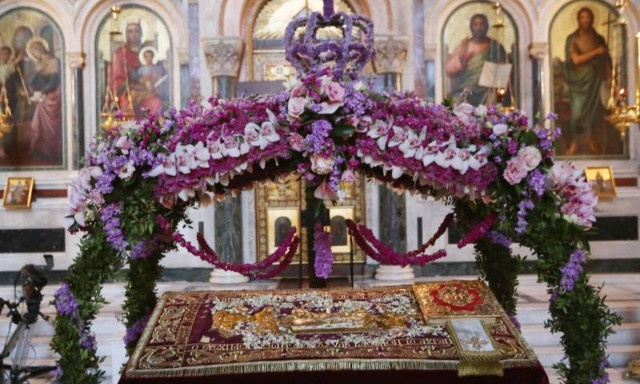 Οι πιστοί πηγαίνουν να προσκυνήσουν τον στολισμένο Επιτάφιο με σεβασμό.