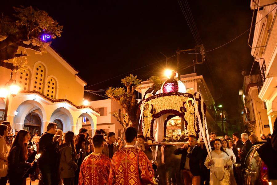 Το βράδυ, οι πιστοί ακολουθούν την πομπή με αναμμένα κεριά, σε κλίμα κατάνυξης.