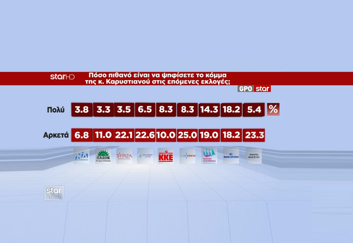 Διαλύει Λατινοπούλου και Ζωή, πλαγιοκοπεί Βελόπουλο, Νίκη και (έκπληξη) ΚΚΕ και γρατζουνάει ΣΥΡΙΖΑ, ΠΑΣΟΚ και ΝΔ η Καρυστιανού, σύμφωνα με τη δημοσκόπηση της GPO για το Star. Κι αυτό, σε όσους απαντούν ότι είναι πολύ πιθανό. Εάν προστεθούν και όσοι δηλώνουν αρκετά πιθανό να ψηφίσουν το υπό ίδρυση κόμμα της, τότε μιλάμε για ριζική αλλαγή του πολιτικού σκηνικού όπως είναι δομημένο σήμερα.