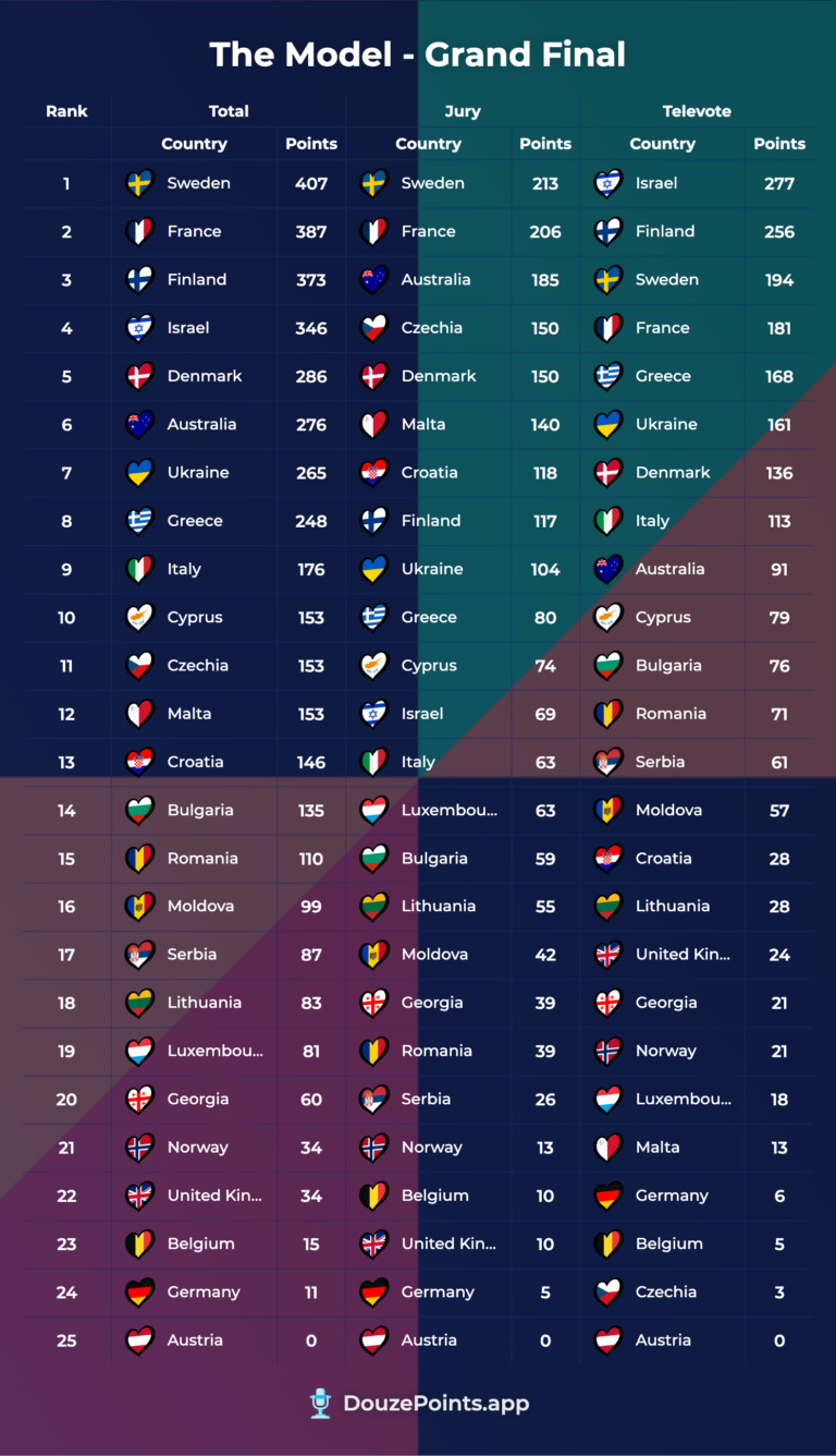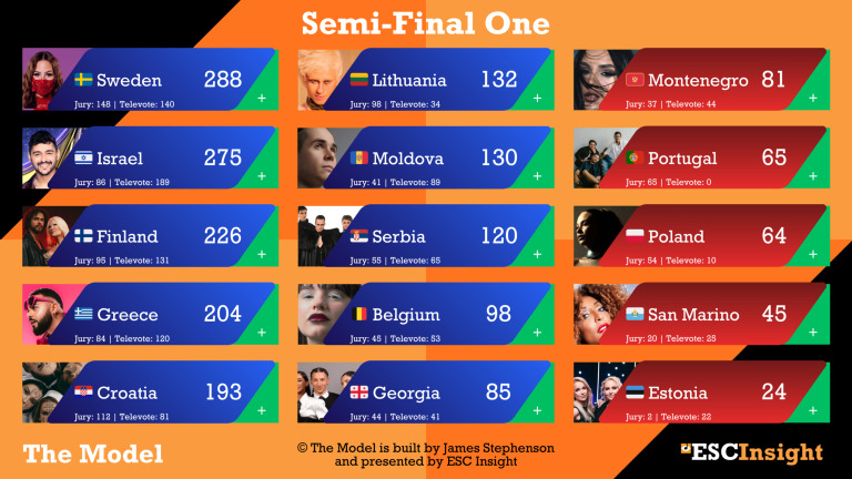 Ωστόσο, το Ισραήλ και η Φινλανδία χάνουν την πρωτιά από τις επιτροπές, που φαίνεται να βγάζουν το Ισραήλ δωδέκατο και τη Φινλανδία όγδοη. Αντίθετα, οι επιτροπές δίνουν την πρωτιά στη Σουηδία, που τελικά το «The Model» προβλέπει να συγκεντρώνει 407 πόντους από τις δύο ψηφοφορίες μαζί. Στη δεύτερη θέση δείχνει να ακολουθεί η Γαλλία με 387 πόντους και στην τρίτη η Φινλανδία με 373 πόντους.