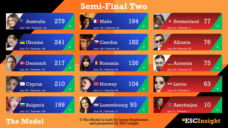 Όσο για την Κύπρο, το «The Model» τη δείχνει κι αυτή στις χώρες του Β’ Ημιτελικού, που καταφέρνουν να προκριθούν. Με την Antigoni να περνά κι αυτή τέταρτη, μετά την Αυστραλία, την Ουκρανία και τη Δανία, ενώ ακολουθούν η Βουλγαρία, η Μάλτα, η Τσεχία, η Ρουμανία, η Νορβηγία και το Λουξεμβούργο. Εκτός Τελικού εδώ φαίνεται να μένουν Ελβετία, Αλβανία, Αρμενία, Λετονία και Αζερμπαϊτζάν.