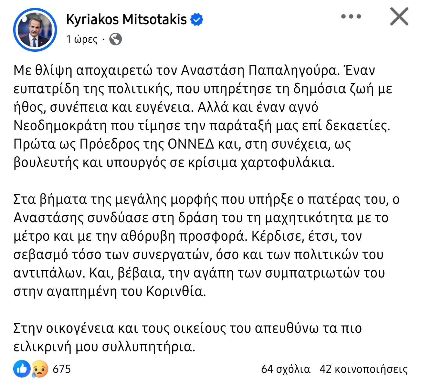 «Ο Αναστάσης Παπαληγούρας αφήνει έντονο το αποτύπωμά του στη δημόσια ζωή του τόπου. Υπηρέτησε την πατρίδα και την παράταξη με αξιοπρέπεια, μαχητικότητα και εντιμότητα, εργάστηκε με συνέπεια για την ιδιαίτερη πατρίδα του και αγαπήθηκε από τους Κορίνθιους συμπολίτες του. Απευθύνουμε τα ειλικρινή μας συλλυπητήρια στην οικογένεια και τους οικείους του» τονίζει σε ανακοίνωσή της η ΝΔ.