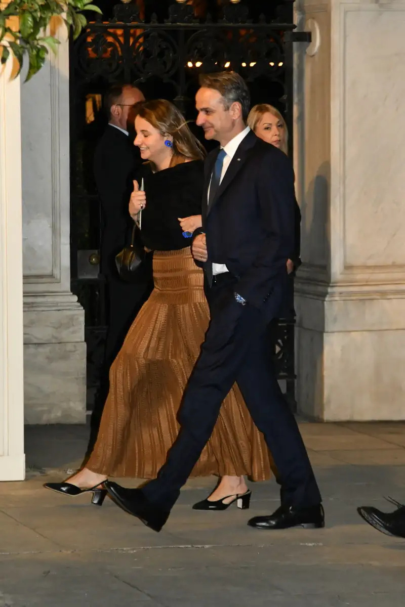 Ο πρωθυπουργός έφτασε στο Προεδρικό Μέγαρο λίγα λεπτά πριν από τις 22:00 για να παραστεί στη δείπνο. Στο πλευρό του, η Δάφνη Μητσοτάκη πραγματοποίησε μια εξαιρετικά κομψή εμφάνιση, κερδίζοντας τις εντυπώσεις καθώς συνόδευε τον πατέρα της σε αυτή τη σημαντική διπλωματική στιγμή.