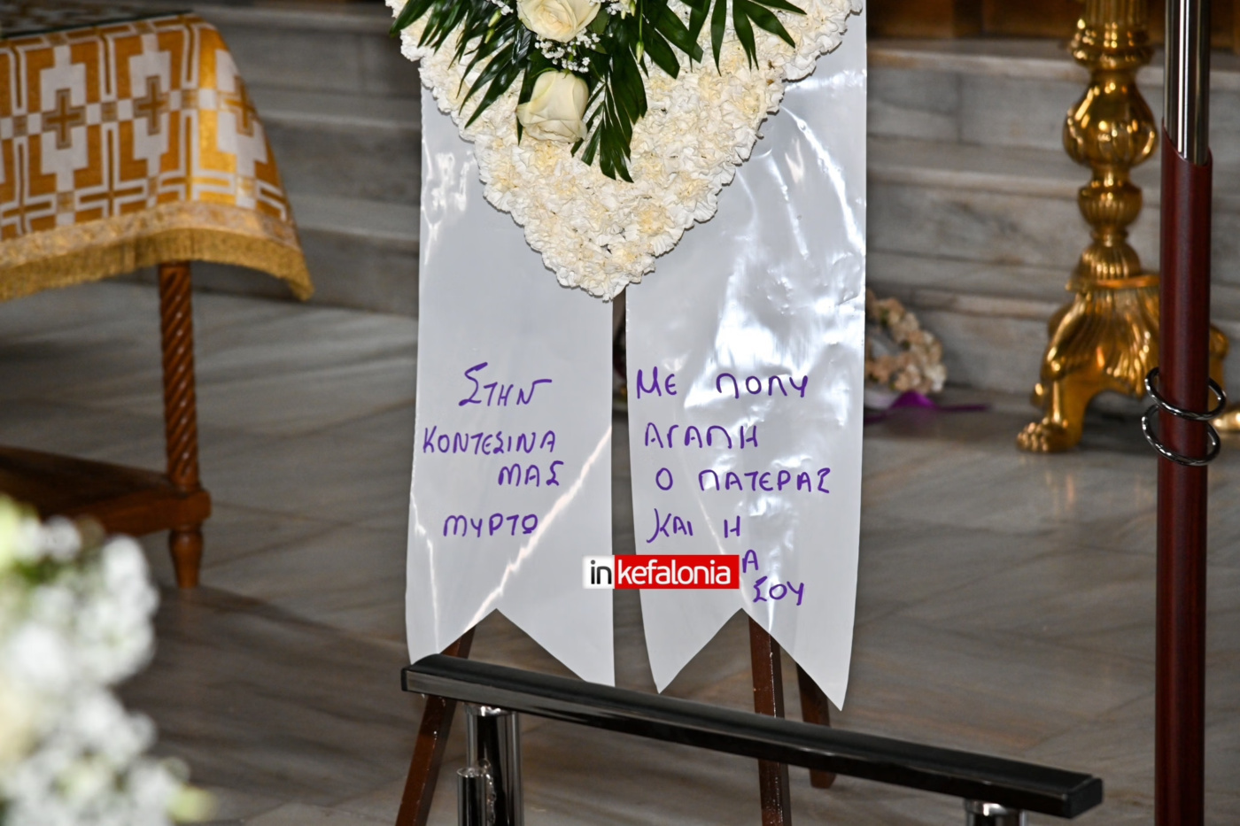 Μέσα σε βαρύ πένθος και συγκίνηση, συγγενείς και φίλοι αποχαιρέτησαν σήμερα τη 19χρονη Μυρτώ στην Κεφαλονιά. Η εξόδιος ακολουθία πραγματοποιήθηκε την Παρασκευή 17 Απριλίου στον Ιερό Ναό Μητροπόλεως Αργοστολίου, στις 15:00 όπου πλήθος κόσμου συγκεντρώθηκε για να πει το τελευταίο «αντίο».