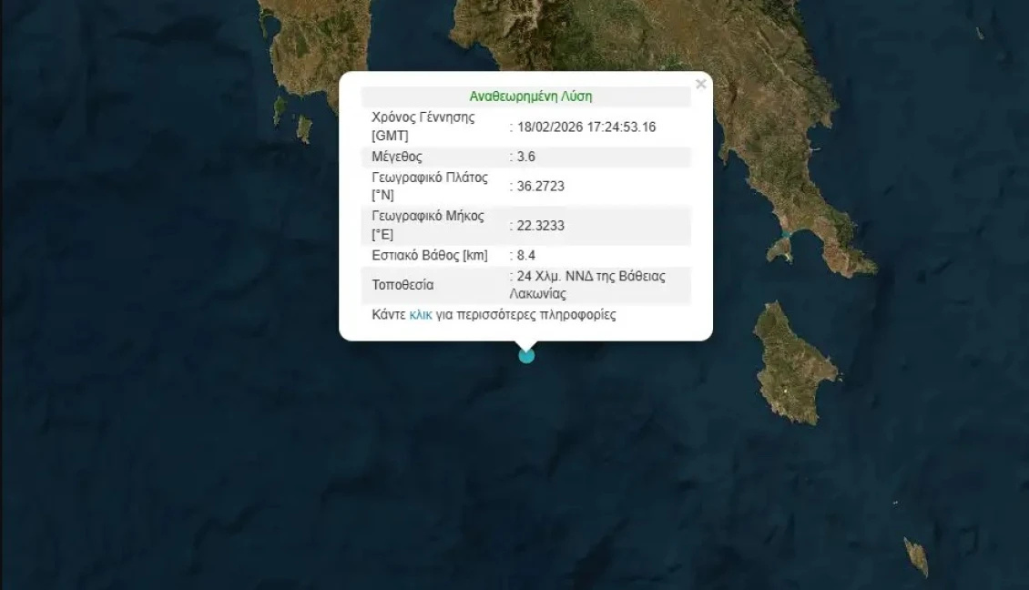 Σεισμός μεγέθους 3,6 βαθμών της κλίμακας Ρίχτερ καταγράφηκε το απόγευμα της Τετάρτης στη Λακωνία, προκαλώντας ανησυχία στους κατοίκους της περιοχής. Σύμφωνα με τα στοιχεία του Γεωδυναμικό Ινστιτούτο του Εθνικό Αστεροσκοπείο Αθηνών, η δόνηση σημειώθηκε στις 19:24. Το επίκεντρο εντοπίζεται στη θαλάσσια περιοχή, 24 χιλιόμετρα νότια – νοτιοδυτικά της Βάθειας Λακωνίας. Το εστιακό βάθος υπολογίζεται στα 8,4 χιλιόμετρα.