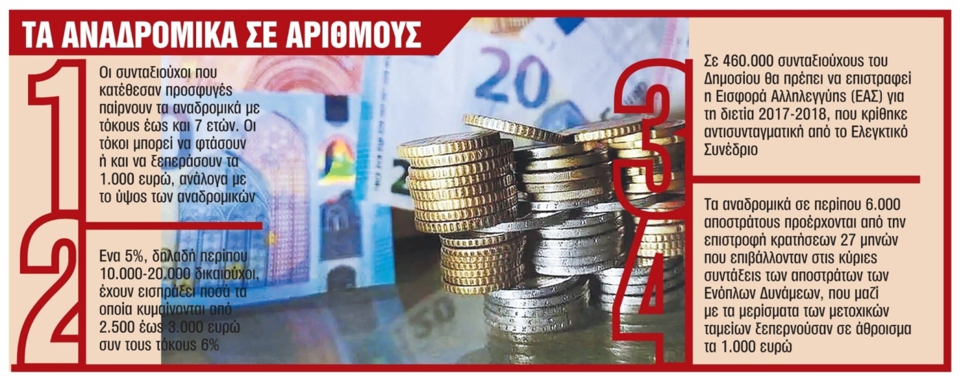 Πάντως επισημαίνεται ότι τα αναδρομικά αυτής της κατηγορίας καταβάλλονται με 6 κρατήσεις-κόφτες, γεγονός που μειώνει τα καταβαλλόμενα ποσά ακόμη και στο μισό!