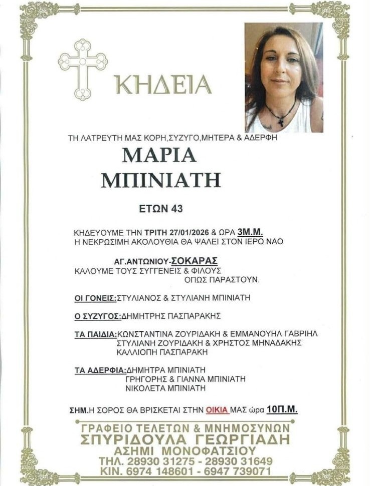 Στα μαύρα ο Σοκαράς του Δήμου Γόρτυνας από τον θάνατο της 43χρονης Μαρίας Μπινιάτη η οποία «έφυγε» τόσο γρήγορα.