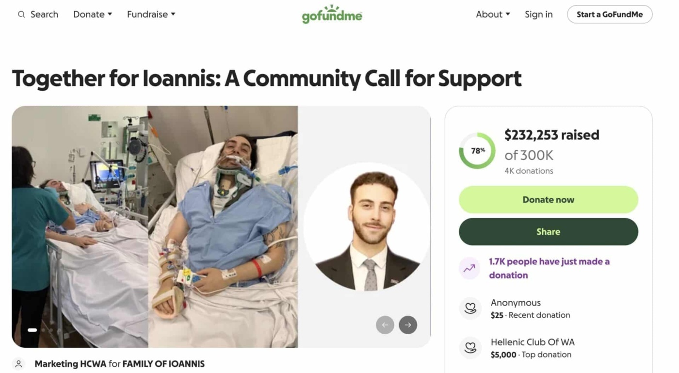 Η ελληνική κοινότητα κινητοποιήθηκε άμεσα, συγκεντρώνοντας σχεδόν 200.000 δολάρια για την κάλυψη των εξόδων νοσηλείας και θεραπείας του