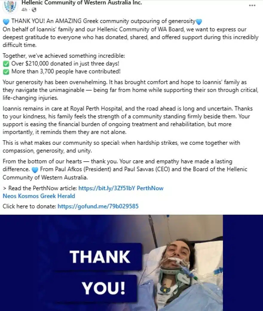 Οι γονείς του 28χρονου ταξιδεύουν από την Ελλάδα προς τη Δυτική Αυστραλία για να βρεθούν στο πλευρό του, ενώ η ελληνική κοινότητα κινητοποιήθηκε άμεσα, συγκεντρώνοντας σχεδόν 200.000 δολάρια για την κάλυψη των εξόδων νοσηλείας και θεραπείας του.