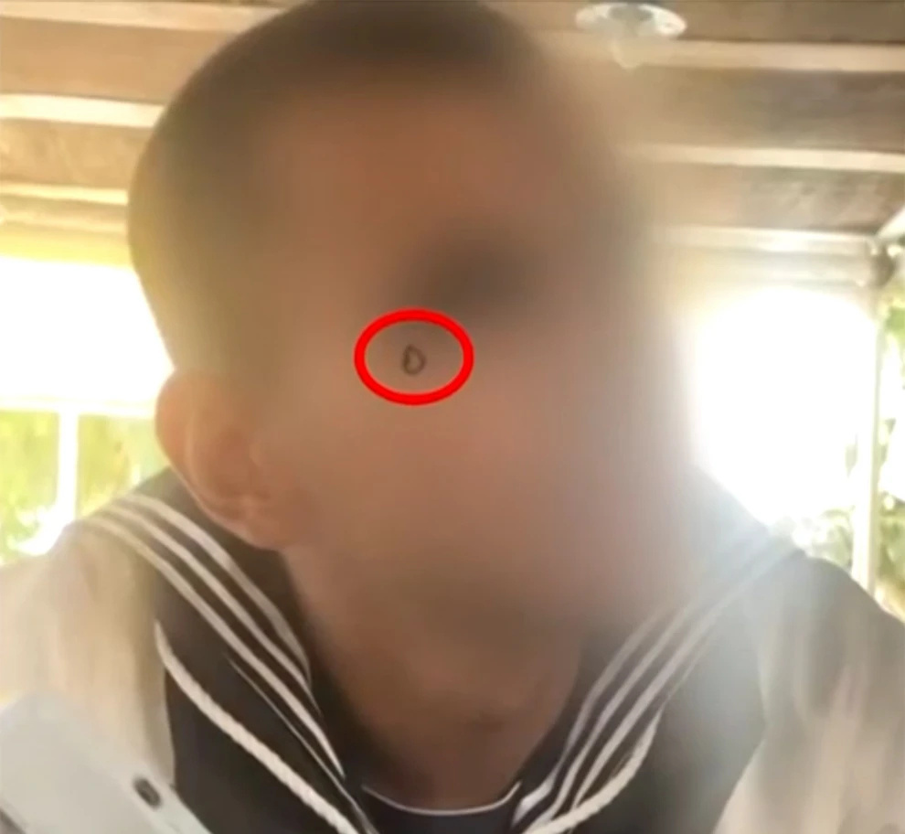 Ο νεαρός έχει κάτω από το μάτι του ζωγραφισμένο ένα δάκρυ, το οποίο φαινομενικά κάνει κάποιος αν έχει βιώσει μεγάλη απώλεια στη ζωή του.