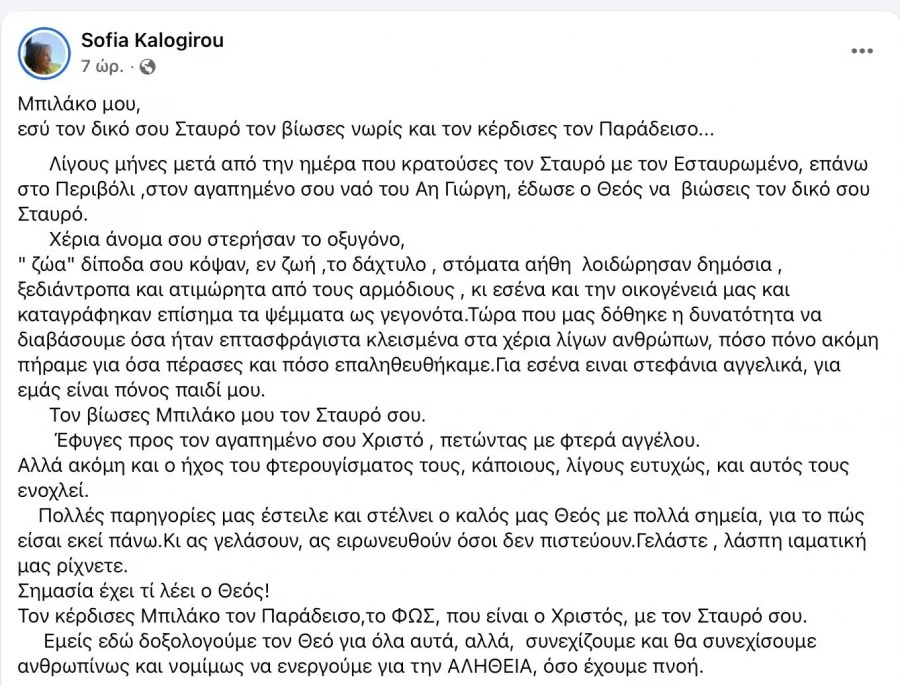 Αναλυτικά η ανάρτηση της μάνας του Βασίλης Καλογήρου