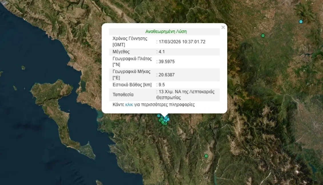 Σεισμική δόνηση μεγέθους 4,1 Ρίχτερ σημειώθηκε το μεσημέρι της Τρίτης στα Ιωάννινα, προκαλώντας αναστάτωση στους κατοίκους των γύρω περιοχών.