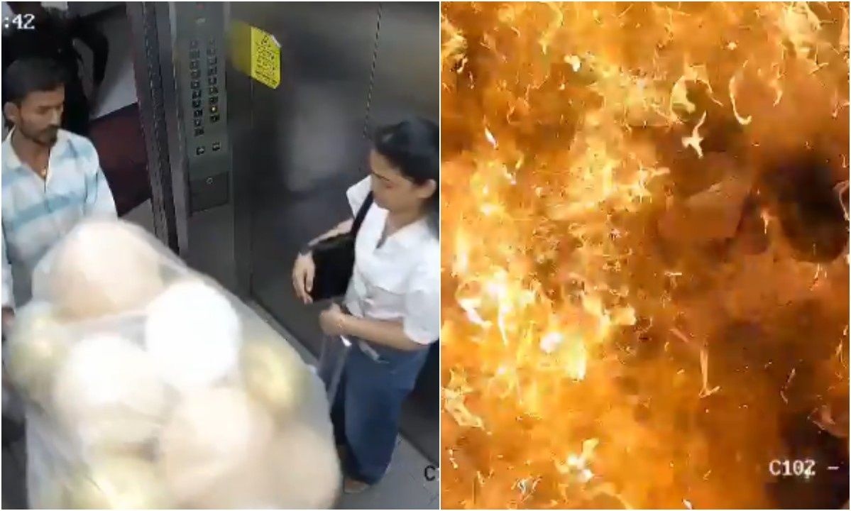 Δύο άνθρωποι τραυματίστηκαν όταν σακούλα γεμάτη φουσκωμένα μπαλόνια εξερράγη μέσα σε ασανσέρ πολυκατοικίας στη Μουμπάι, προκαλώντας σύντομη πύρινη «κόλαση» που κατεγράφη από κάμερα ασφαλείας.