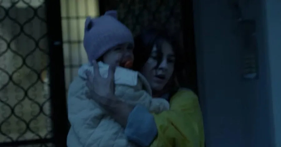 Πριν περάσει την έξοδο, παίρνει στον ώμο μια μεγάλη τσάντα που έχει ετοιμάσει και κλείνει, όσο πιο προσεκτικά μπορεί, την πόρτα. Κατεβαίνει τρέχοντας τις σκάλες και τρέχει προς το αυτοκίνητο της, ενώ το μωρό αρχίζει να κλαίει. Βάζει το παιδί στο καρεκλάκι του πίσω καθίσματος, του λέει «αγάπη μου, πάμε μια βόλτα ε; Θα περάσουμε ωραία. Έλα. Φιλάκι».