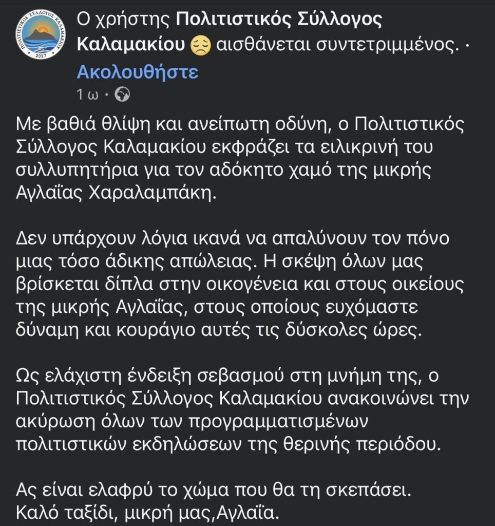 Ο Πολιτιστικός Σύλλογος Καλαμακίου εξέδωσε ανακοίνωση εκφράζοντας τη βαθιά του θλίψη και τα ειλικρινή του συλλυπητήρια προς την οικογένεια και τους οικείους της μικρής.