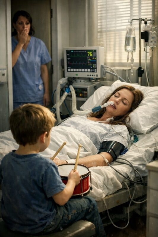 Ένα μικρό αγόρι, από πίσω, χτυπούσε απαλά το τύμπανο, καθισμένο δίπλα στο κρεβάτι της Έλενορ. Η Λόρα εισέπνευσε για να φωνάξει… αλλά σταμάτησε αμέσως.