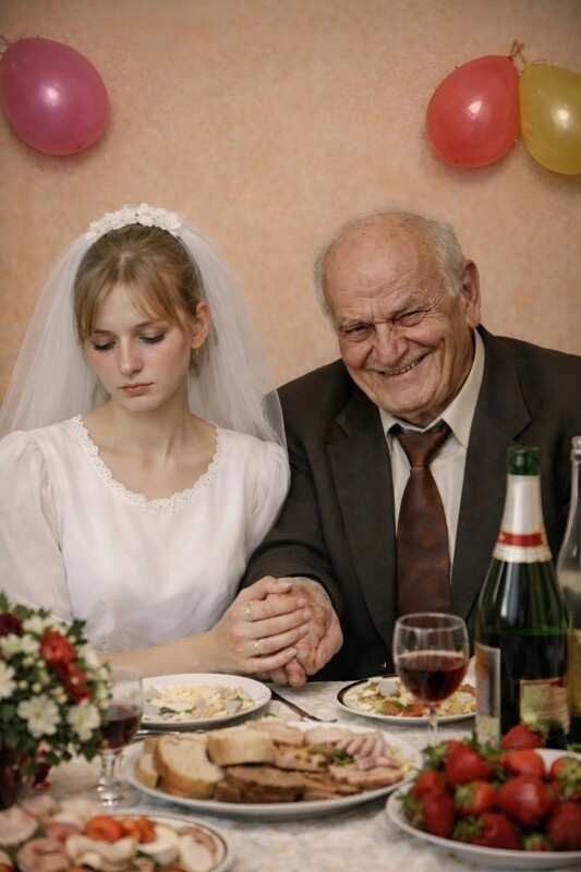 Ο γάμος τελικά έγινε. Η κοπέλα καθόταν με το βλέμμα χαμηλωμένο. Ο γέρος της κρατούσε το χέρι υπερβολικά σφιχτά και χαμογελούσε σαν να είχε κερδίσει κάτι πολύτιμο.