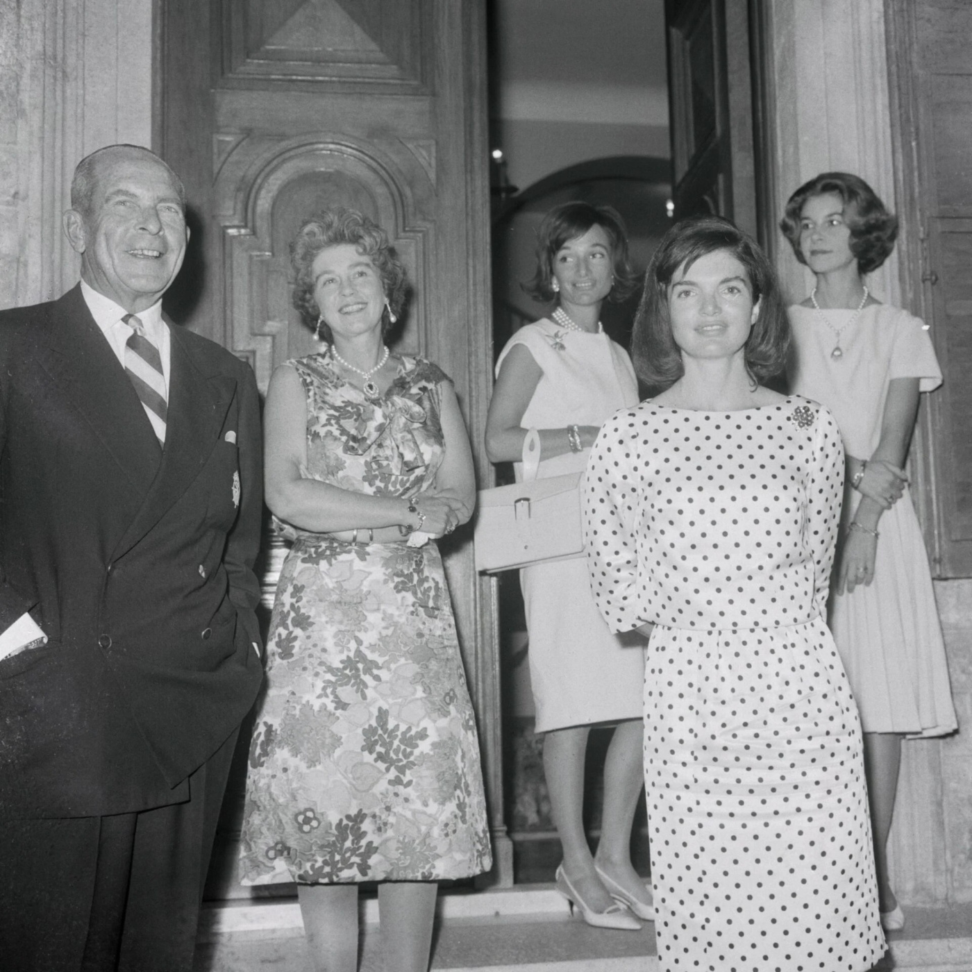 Οι φωτορεπόρτερ απαθανατίζουν την Ζακλίν Κένεντι με το βασιλικό ζεύγος στο Τατόι στα πλαίσια της ιδιωτικής επίσκεψής της στην Ελλάδα. Η Πρώτη Κυρία της Αμερικής συνοδευόταν από την αδερφή της Λι Ράτζβιλ (δίπλα στην πριγκίπισσα Ειρήνη), 1963