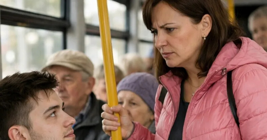 Στην επόμενη στάση μπήκε μια μητέρα με δύο μικρά παιδιά. Το ένα κρατιόταν από το χέρι της, το άλλο στεκόταν κολλημένο στο πλευρό της. Δεν υπήρχαν ελεύθερες θέσεις. Η γυναίκα κοίταξε γύρω της και αμέσως στάθηκε το βλέμμα της στον νεαρό. Πλησίασε και είπε δυνατά, χωρίς να κρύβει τον εκνευρισμό της: