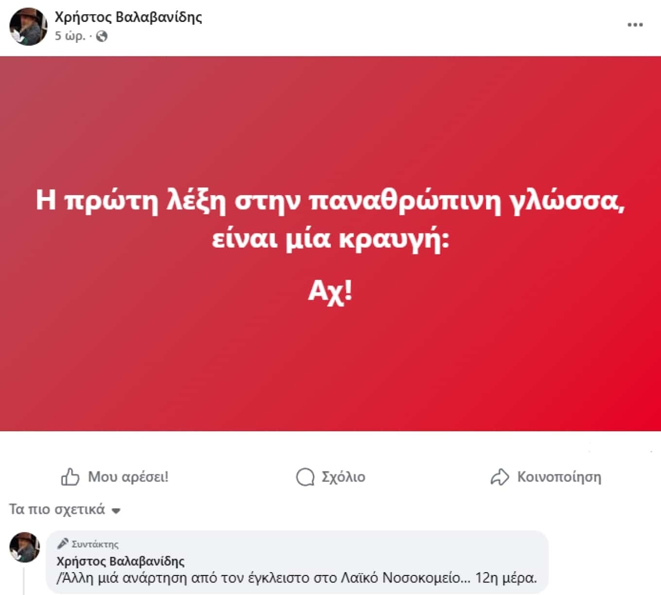 Την Τρίτη 30 Δεκεμβρίου έκανε μία ακόμη ανάρτηση στο προφίλ του, στην οποία έγραψε αυτή τη φορά: «Η πρώτη λέξη στην πανανθρώπινη γλώσσα, είναι μία κραυγή: Αχ!» και στα σχόλια σημείωσε: «Άλλη μία ανάρτηση από τον έγκλειστο στο Λαϊκό Νοσοκομείο… 12η μέρα».