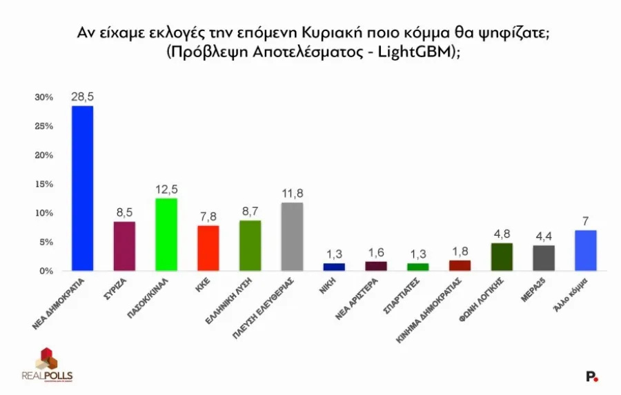 Στην πρόβλεψη αποτελέσματος η Νέα Δημοκρατία μετριέται στο 28,5% ενώ το ΠΑΣΟΚ-ΚΙΝΑΛ στο 12,5%. Ακολουθούν Πλεύση Ελευθερίας με 11,8%, Ελληνική Λύση με 8,7%, ΣΥΡΙΖΑ με 8,5%, ΚΚΕ με 7,8%, Φωνή Λογικής με 4,8%, ΜέΡΑ25 με 4,4%.