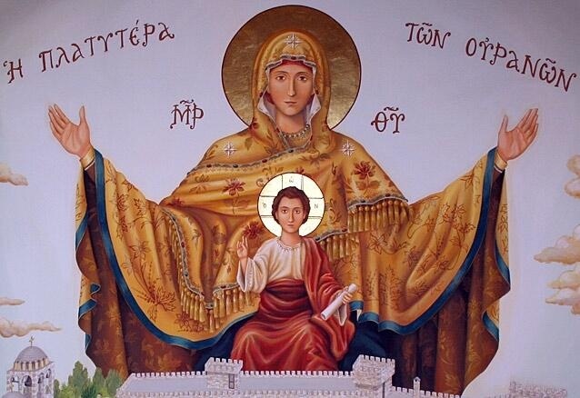 Κυριώνυμη Παναγία, Ναέ Θεού, ακατάλυτος, Ουρανώσασα τον χουν, Όμβρος ζωοδότης άλυτος, Όνομα πολυπόθητον, Σκήνωμα οχυρώσασα απόρθητον, Στήριγμα ευσεβών, σκεύος Ιερόν αλώβητον, Αγίας Τριάδος δώρημα το τέλειον παρρησίας, η Χάρις νοερών, παρισταμένη τω Θεώ, φλοξ αθανασίας.